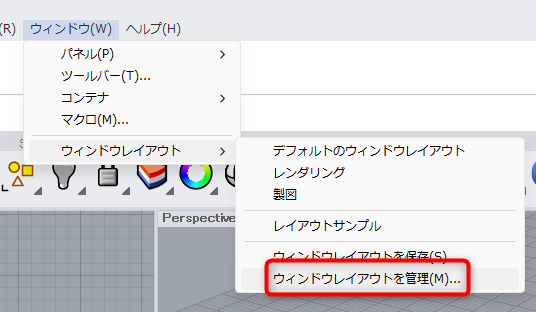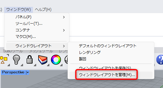 3.再度、ウィンドウメニュー > ウィンドウレイアウト > ウィンドウレイアウトを管理 を実行。