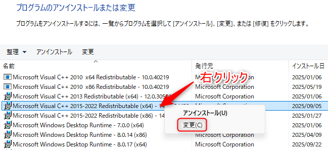 3.Microsoft Visual C++ 2015-2022 Redistributable を右クリックし「変更」を選択します。