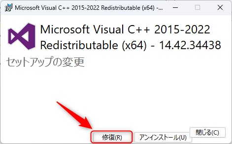4. Microsoft Visual C++ 2015-2022 Redistributableのダイアログ画面の「修復」ボタンをクリックします。