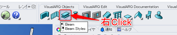VisualARQ Objectsタブの [Beam] アイコンを右クリックします。