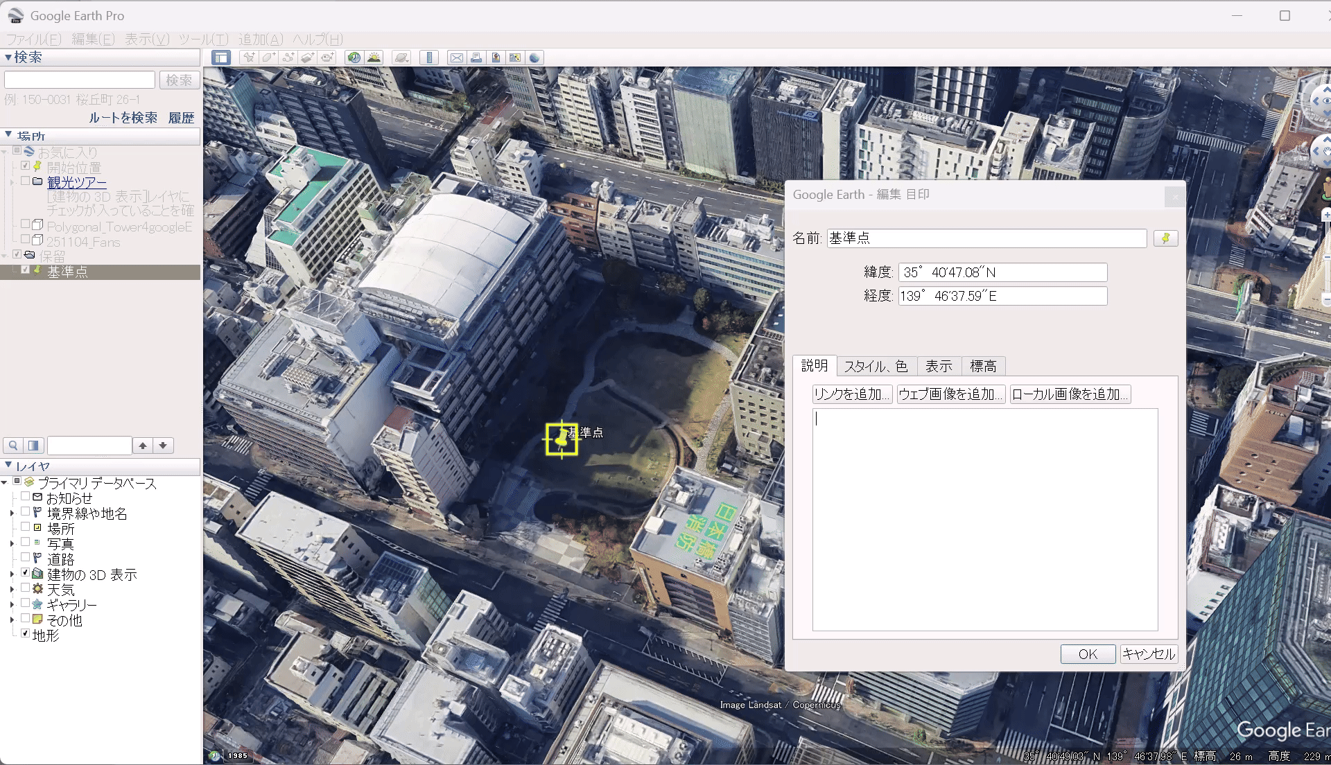 ②Google Earth Proを起動し、モデルを配置したい地点の緯度・経度(度・分・秒)を取得します。