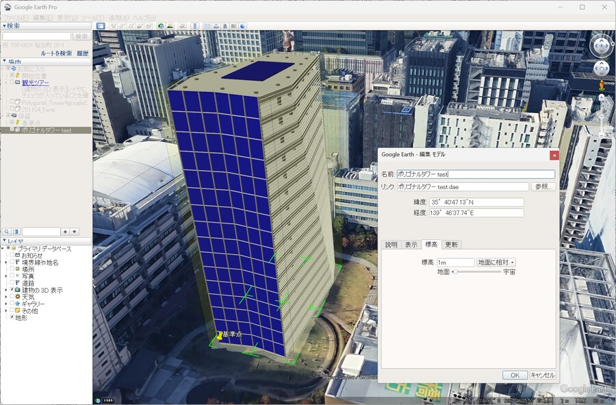 またEarthAnchorPoint の設定では、高度は 0 に設定します。これは、Google Earth Pro 上での表示位置をまず 水平位置(緯度・経度)に基づいて確認することを目的としているためです。高度を含めた詳細な位置調整は、表示確認後に行うことができます。