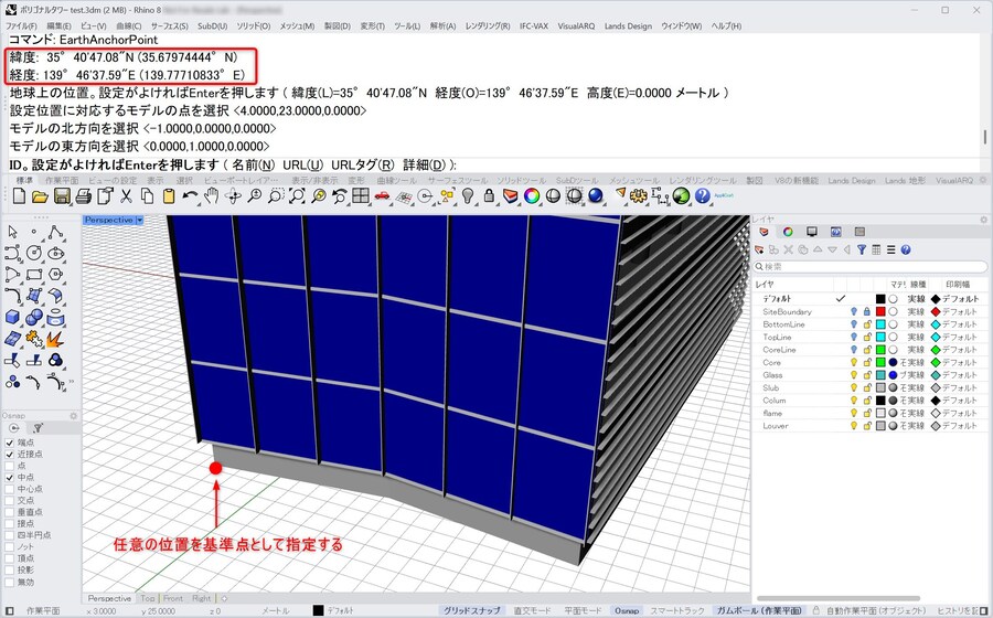 ➂Rhino の「EarthAnchorPoint」コマンドを実行し、Google Earth Proで取得した緯度・経度を入力し、モデルの基準点を指定します。