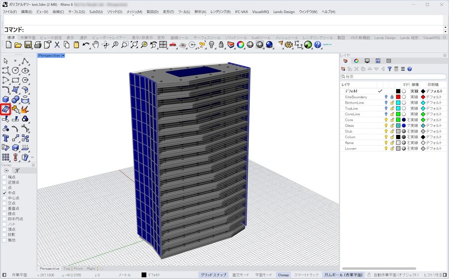 ①ArcGIS Earthに表示したいRhinoモデルを用意します。ジオメトリタイプがメッシュではない場合、「Mesh」コマンドでモデルをメッシュに変換します。