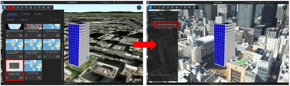 本記事では、ArcGIS Onlineに共有されている「Tokyo Metro 3D Mesh CityMapper2_WSL1(シーンレイヤ)」のデータを追加しています。