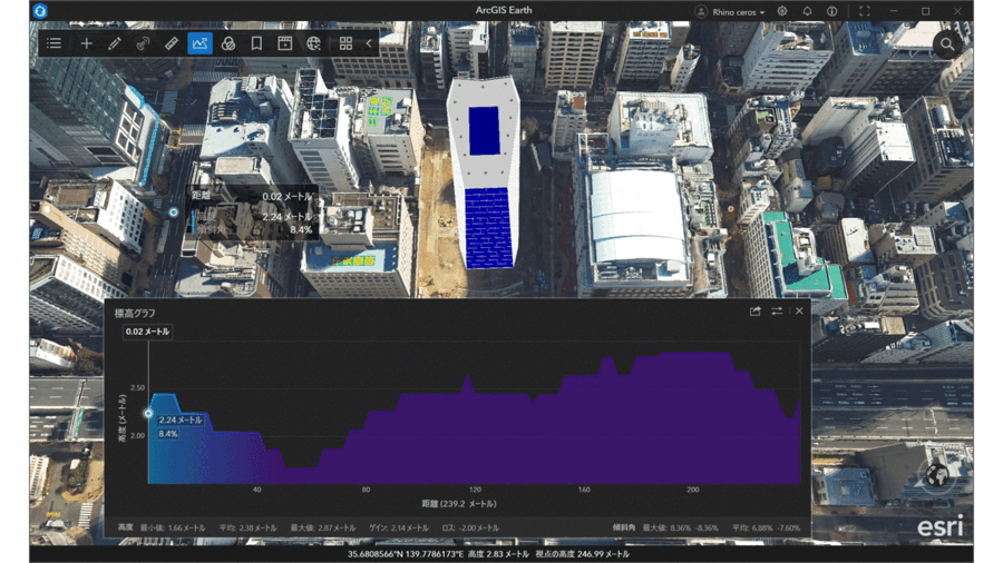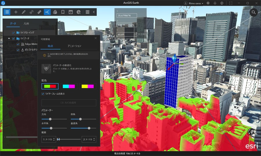 本記事では、Rhinoで作成した3Dモデルを ArcGIS Earth に読み込み、「対話的解析」機能を使って簡易的な3D解析を行いました。