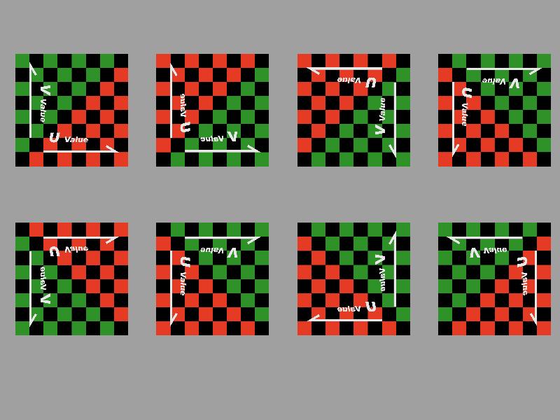 このとき、サーフェスの属性情報によってマッピングされる向きが意図した方向に向いていない事がおきることがあります。サーフェスは、内部にUV空間という2次元の領域情報を持っています。これは我々が普段、認識しているXY空間に似ていますが、サーフェスの持つU,Vのパラメーターの方向は、単純にお互いに直交する方向にあれば良いという規則ですので、U,V方向がXY空間でいうところのX方向、-X方向、Y方向、-Y方向のどの方向にも向くことがありえます。単純な矩形のサーフェスに、テクスチャをマッピングしてみましょう。そのときは、可能性としては左図のような8つのマッピングが結果として出てきます。